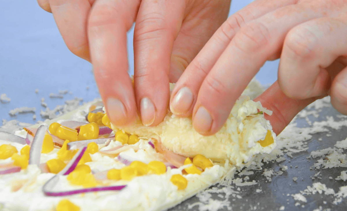 3. Streiche Frischkäse auf den Rest des Teiges und verteile darauf Zwiebeln, Kochschinken und Mais.