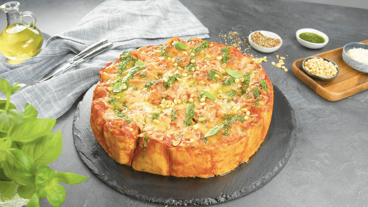6. Garniere den Pizzaröllchen-Kuchen mit Pesto, gerösteten Pinienkernen und frischem Basilikum.