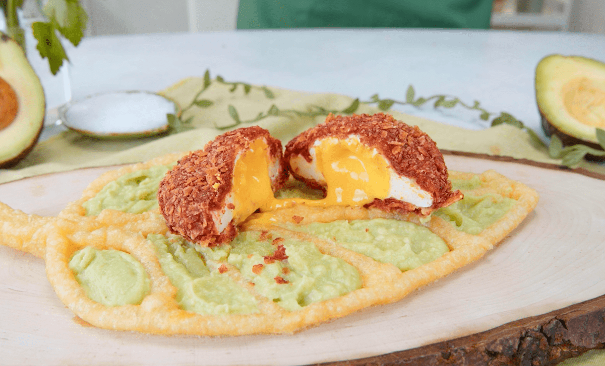 Du fragst dich, wie pochiertes Ei, Brandteig und Avocado zusammenpassen? Wir sagen dir: Hervorragend! Mit einem Spritzbeutel formen wir ein Blatt aus Brandteig und veredeln dieses mit einer Zitronen-Avocado-Creme. Als Krönung kommt ein pochiertes Ei in Knusperkruste oben auf das Blatt. Das sieht nicht nur sagenhaft aus, das schmeckt auch ungewöhnlich gut.