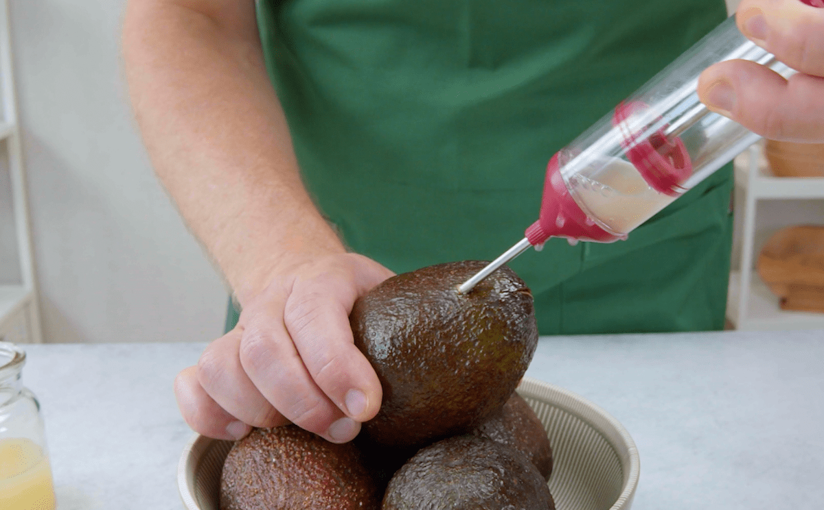 3. Fülle die Lebensmittelspritze mit Zitronensaft und spritze diesen dann in die Avocado. Bewege die Spritze dabei hin und her, damit die Avocadomasse im Inneren weich und cremig wird.