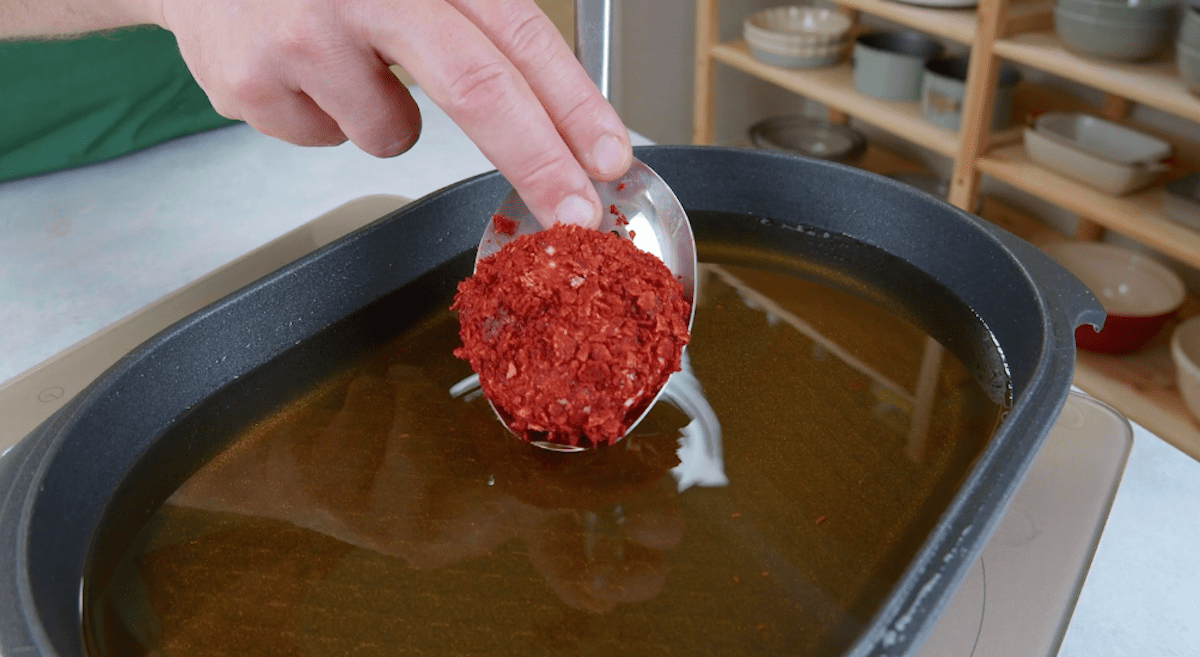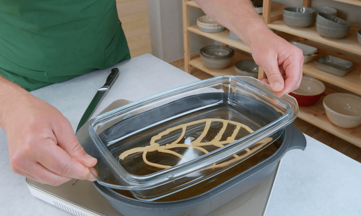 2. Erhitze das Frittierfett auf ca. 180 °C. Drehe die Auflaufform um und spritze den Brandteig in Form eines Blattes auf ihre Unterseite. Drehe die Form erneut um und tauche sie für ca. 3-5 Minuten in das heiße Fett. Löse danach das Blatt vorsichtig mit einem Messer von der Form und lege es auf einen Teller.