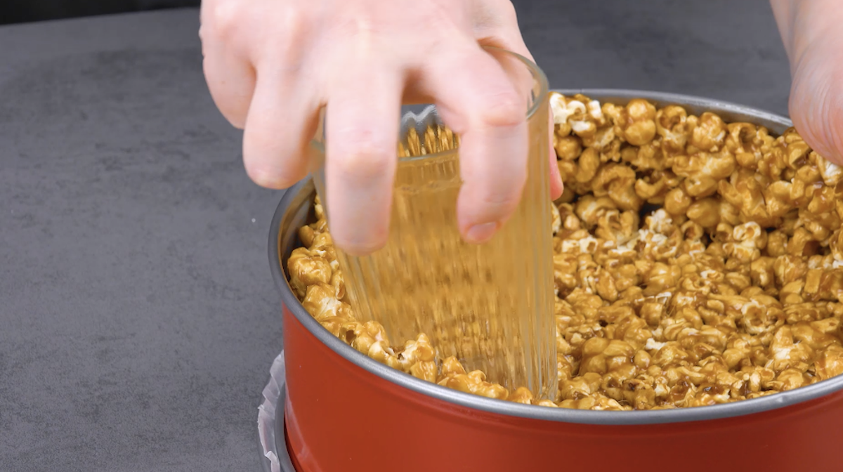 4.) Gib das Karamell-Popcorn nun in eine gefettete Springform und drücke es mit einem eingefetteten Glas so zurecht, dass am Rand der Form ein genauso hoher Popcorn-Rand entsteht.
