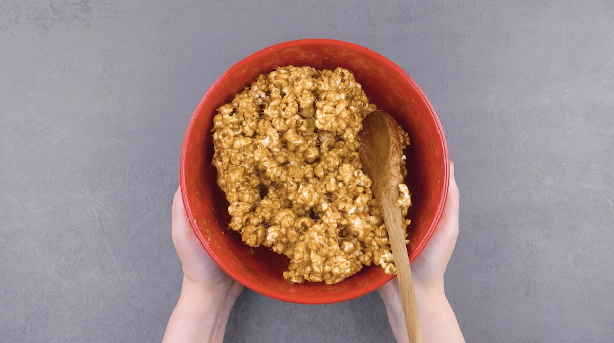 3.) Gib das Popcorn in eine Schüssel und gieße das Karamell darüber. Verrühre alles so gut miteinander, dass das ganze Popcorn mit dem Karamell ummantelt ist.