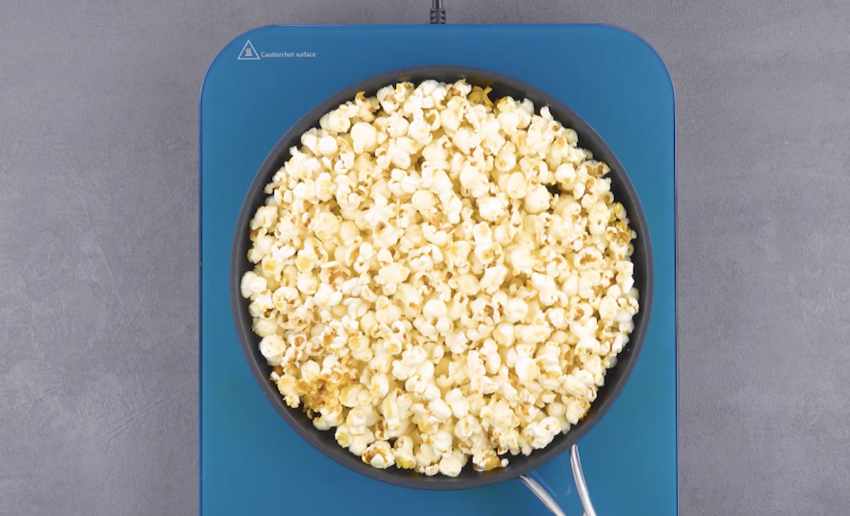 1.) Als Erstes bereitest du das Popcorn zu. Gib Öl und den Popcornmais in eine Pfanne oder in einen Topf und setze einen Deckel darauf. Erwärme den Mais nun bei mittlerer Hitze. Achte darauf, dass die Maiskörner nicht aufeinanderliegen. Wenn die zeitlichen Abstände, in denen die einzelnen Maiskörner nacheinander aufpoppen, größer als etwa 3 Sekunden werden, kannst du die Herdplatte ausstellen.