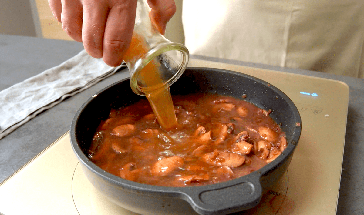 2. Schneide die Pilze in dünne Scheiben, die rote Zwiebel in kleine Würfel und brate beides an. Lösche mit Rotwein ab und lass diesen reduzieren. Gieße dann den Gemüsefond hinzu und lass die Sauce 15 Minuten köcheln.