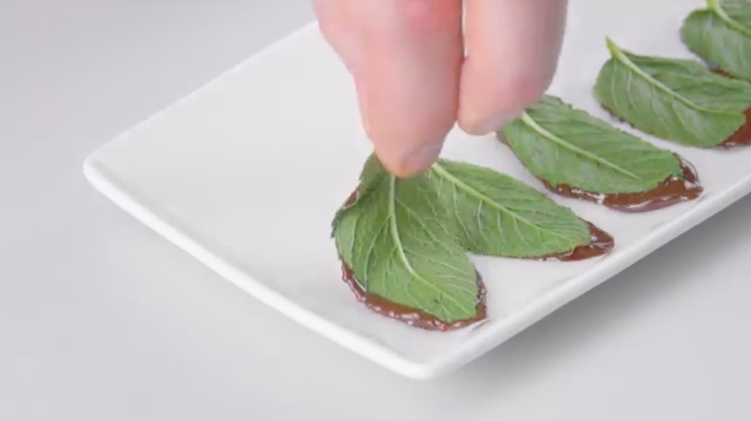 7.) Schmilz Zartbitterschokolade und tauche vorsichtig eine Seite der Minzblätter hinein. Lass die Blätter mit der Schokoschicht gut abkühlen und aushärten. Zupfe dann die Blätter sachte von der Schokolade ab.