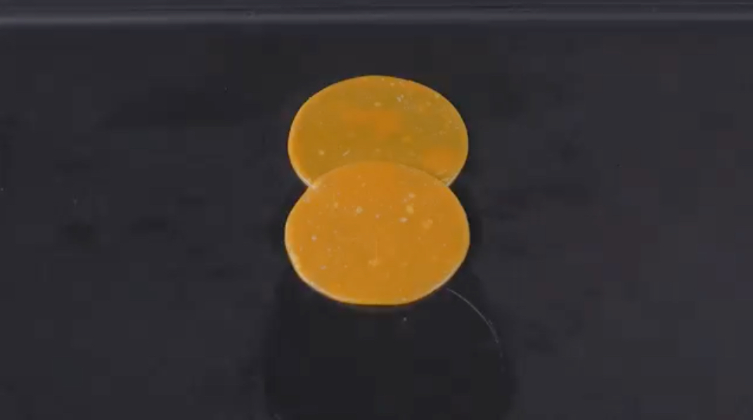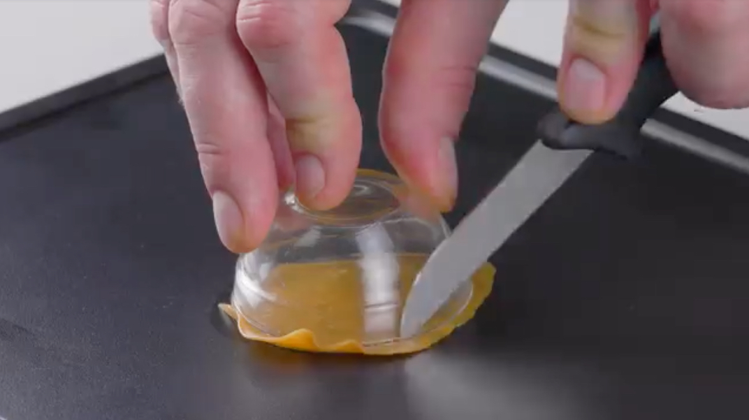 4.) Lege ein Karamellbonbon auf ein Backblech und bedecke es mit einem Blatt Backpapier. Jetzt rolle es mit einem Nudelholz durch das Papier hindurch flach. Drücke eine kleine Schüssel oder ein Tässchen darauf und schneide einen Kreis aus.