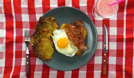 Für die Hash Browns schälst du die Kartoffeln und reibst sie in eine Schüssel. Wasche mit kaltem Wasser die Stärke aus den Kartoffeln. Daraufhin drückst du das Wasser aus den geriebenen Kartoffeln heraus und brätst sie in Butterschmalz goldbraun an. Würze sie noch mit Salz und Pfeffer.