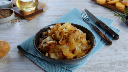 Brate die Scheibchen nun in Öl an. Gib Bacon und Zwiebeln hinzu und würze alles mit Salz und Pfeffer. Zum Schluss gibst du noch gehackte Petersilie dazu.