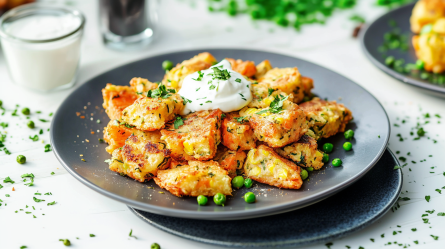 Serviere den Gemüseschmarrn mit jeweils 1 EL Schmand und garniere mit etwas frischer Petersilie.