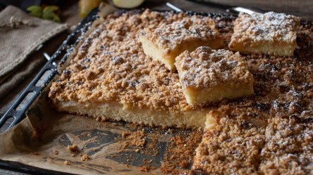Tipp: Wer den Hefekuchen etwas fruchtiger mag, kann vor den Streuseln eine Schicht Pflaumenmus auf dem Teig verteilen.