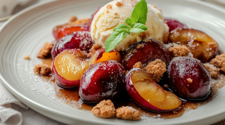 Richte die Pflaumen auf Tellern an, gib eine Kugel Vanilleeis hinzu und streue die Kekskrümel darüber.