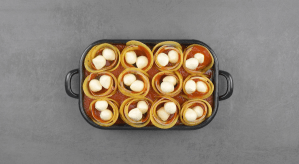 Pro Röllchen legst du noch 2 kleine Kugeln Mozzarella obenauf.
