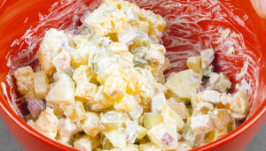 Brate die Hähnchenbrust mit Salz, Pfeffer und Paprikapulver in einer Pfanne von beiden Seiten an. Schneide sie dann ebenfalls klein und gib sie zu den Kartoffeln. Füge noch kleingeschnittene Zwiebeln, Äpfel, etwa die Hälfte der Gewürzgurken sowie Mayonnaise und saure Sahne hinzu und vermenge alles miteinander. Würze alles noch mit Salz und Pfeffer.