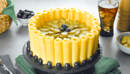Entferne dann den Ring der Springform. Rolle die Käsescheiben ein (wenn sie nicht halten wollen, kannst du sie leicht mit Mayonnaise bestreichen). Setze die Röllchen dann ringsherum um den Kartoffelsalat-Kuchen. Verziere ihn noch mit schwarzen Oliven.