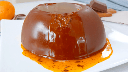 Gieße direkt vor dem Servieren die heiße Orangensoße in die Mulde, sodass die Schokolade zu schmelzen beginnt.