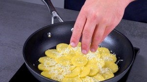 Schäle die Kartoffeln und schneide sie in dünne Scheiben. Erwärme etwas Öl in einer Pfanne und lege die Kartoffelscheiben einander überlappend hinein. Bestreue die Kartoffeln mit Parmesan und lass das Ganze abgedeckt 5 Minuten köcheln.
