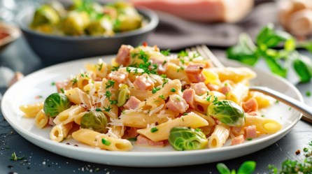 Gib den Rosenkohl und die gekochte Pasta mit in die Pfanne. Gieße das Nudelwasser hinzu und verrühre alles gut miteinander.