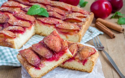 Verteile den Teig dann gleichmäßig auf dem Blech und verteile die Pflaumenstücke dicht darauf.