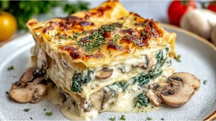 Gib ein Drittel der Spinat-Champignon-Mischung darüber, anschließend etwas Béchamelsoße. Wiederhole diesen Vorgang zwei- bis dreimal. Schließe mit einer Schicht Béchamel ab und streue geriebenen Käse darüber.