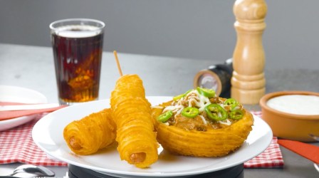 Frittiere die Stampfkartoffelwürstchen anschließend ebenfalls für 2-3 Minuten, bis sie goldbraun sind.