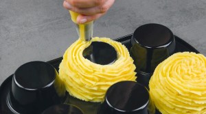 Drehe ein Muffinblech um und fette es ein. Spritze nun die mit Brandteig vermischten Stampfkartoffeln um drei Muffinmulden herum, sodass sich kleine Türmchen bilden. Stelle das Muffinblech anschließend für ca. 1,5 Stunden in den Tiefkühler.