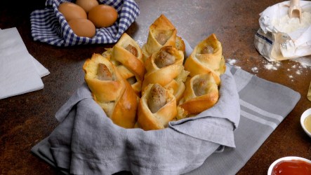 Verquirle das Ei und bestreiche damit den Pizzateig, bevor du die Wursttaschen für 12 Minuten bei 180 °C Umluft backst.