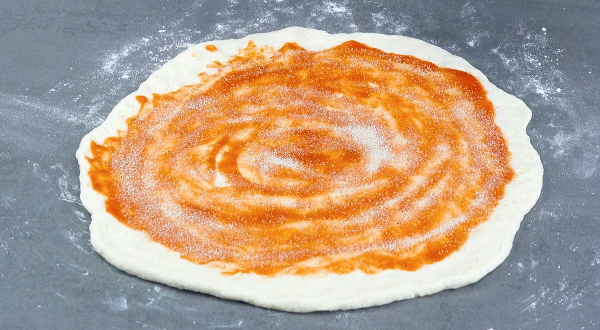 2. Während das Pulled Chicken gart, kannst du bereits den Pizzateig zubereiten. Schütte das Mehl in einem Haufen auf deine Arbeitsfläche und forme eine Mulde in die Mitte. Die Mulde füllst du mit Joghurt, Backpulver sowie Salz. Bedecke das Ganze dann mit Mehl und knete die Masse zu einem weichen Pizzateig. Rolle diesen anschließend rund aus, bestreiche ihn mit Tomatensauce und bestreue ihn mit Semmelbröseln.