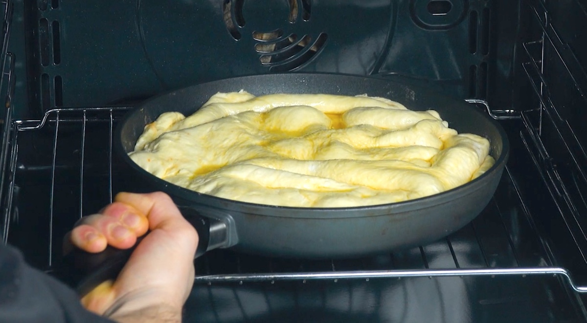 Wenn du eine Pizza selber machst, rollst du bestimmt als Erstes den Teig aus, bestreichst ihn dann mit einer Soße und belegst ihn nach Herzenslust, bevor du die Pizza in den Ofen schiebst. Aber hast du schon mal daran gedacht, den Spieß einfach umzudrehen? Du kannst den Pizzateig nämlich auch einfach auf den Belag legen. Das Ergebnis ist ungemein köstlich!