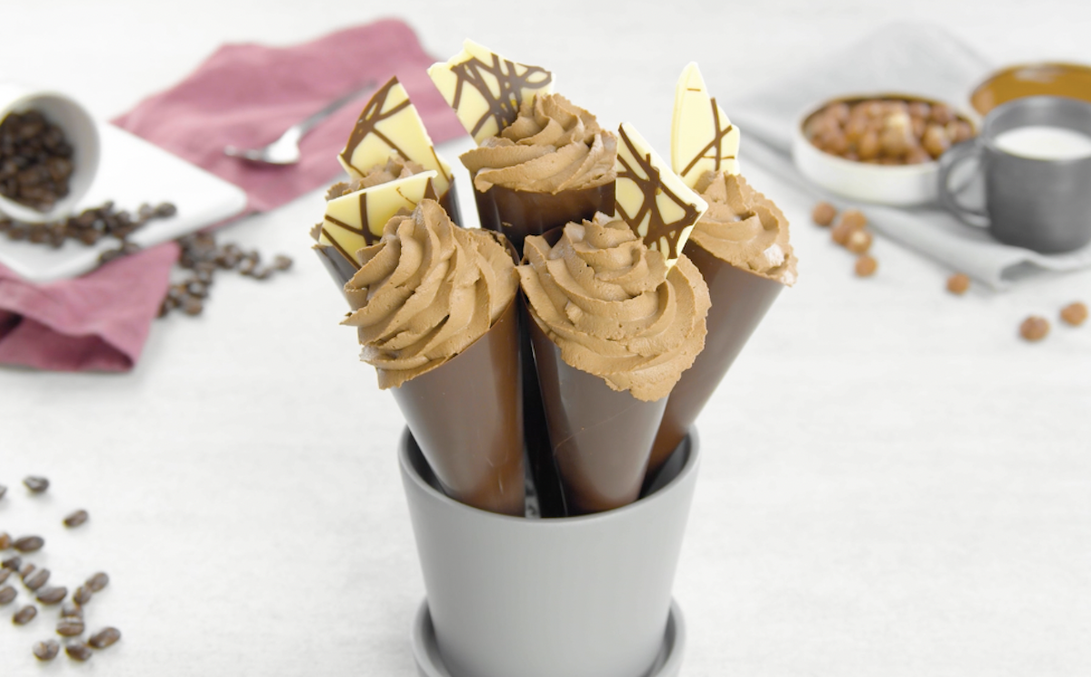 Diese hübschen Schokotüten mit Schokomousse und Bruchschokolade sind wirklich das perfekte Finale für einen kulinarisch gelungenen Abend in der Familie oder unter Freunden. Und wer hätte gedacht, dass es so einfach ist, Bruchschokolade selber zu machen? Wer es gerne ein bisschen bunter mag, verwendet anstatt der weißen Kuvertüre einfach rosa Ruby-Schokolade.