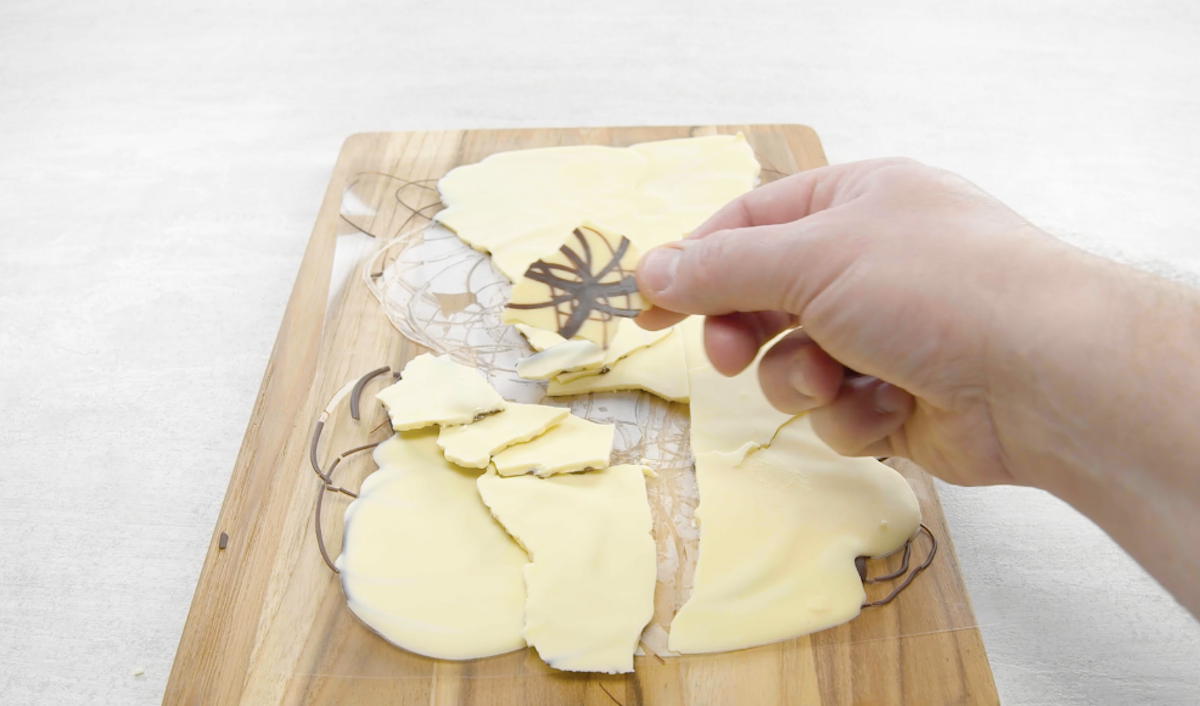 3. Lege die fünfte Folie auf ein Brett. Verteile mithilfe eines Löffels die temperierte Zartbitterkuvertüre in Kreisen auf der Folie. Lasse die Schokokreise ca. 5 Minuten lang fest werden. Dann verteilst du die weiße Kuvertüre gleichmäßig auf der Folie. Lasse alles fest werden und brich die Schokolade dann in grobe Stücke.