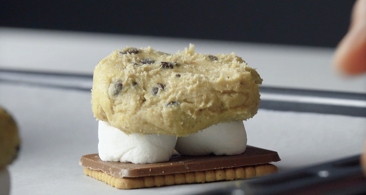 4.1) Stelle den Keksteig her. Bedecke je einen Butterkeks mit einer Schokotafel und zwei Marshmallow-Hälften. Lege obendrauf etwas Keksteig (ca. 90 g).