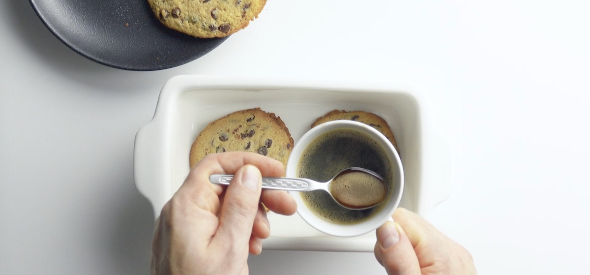 2.1) Stelle den Keksteig her. Forme Cookies daraus und backe sie für 10 Minuten bei 180 °C Ober-/Unterhitze. Lasse die Kekse dann abkühlen. Lege zwei Cookies nebeneinander in eine kleine Auflaufform und übergieße sie mit etwa 1/3 des Kaffees.