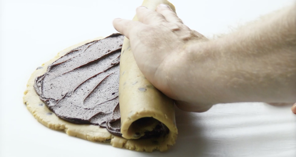 Rolle den Keksteig aus und verteile den Brownieteig gleichmäßig darauf. Rolle den Teig dann zusammen und lege ihn für mindestens zwei Stunden in den Kühlschrank.