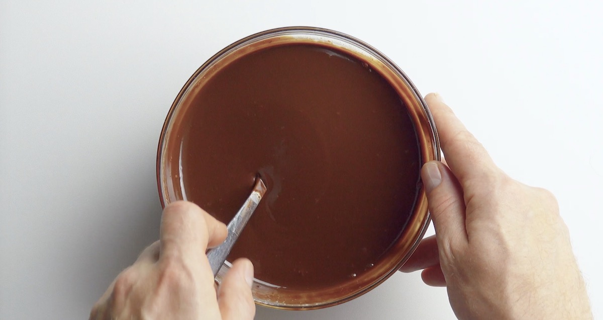 1.3) Lasse die Löffel nach dem Backen vollständig auskühlen. Währenddessen kannst du das Schokomousse herstellen: Erhitze dafür die Sahne und schmilz darin die Zartbitterschokolade. Lasse das Ganze dann abkühlen und hebe zum Schluss die Sahne unter.
