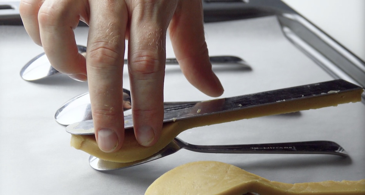 1.2) Lege nun Löffel verkehrtherum auf ein Backblech und platziere auf ihnen vorsichtig die ausgeschnittenen Teiglöffel. Backe die Löffel dann für 10 Minuten bei 180 °C Ober-/Unterhitze.