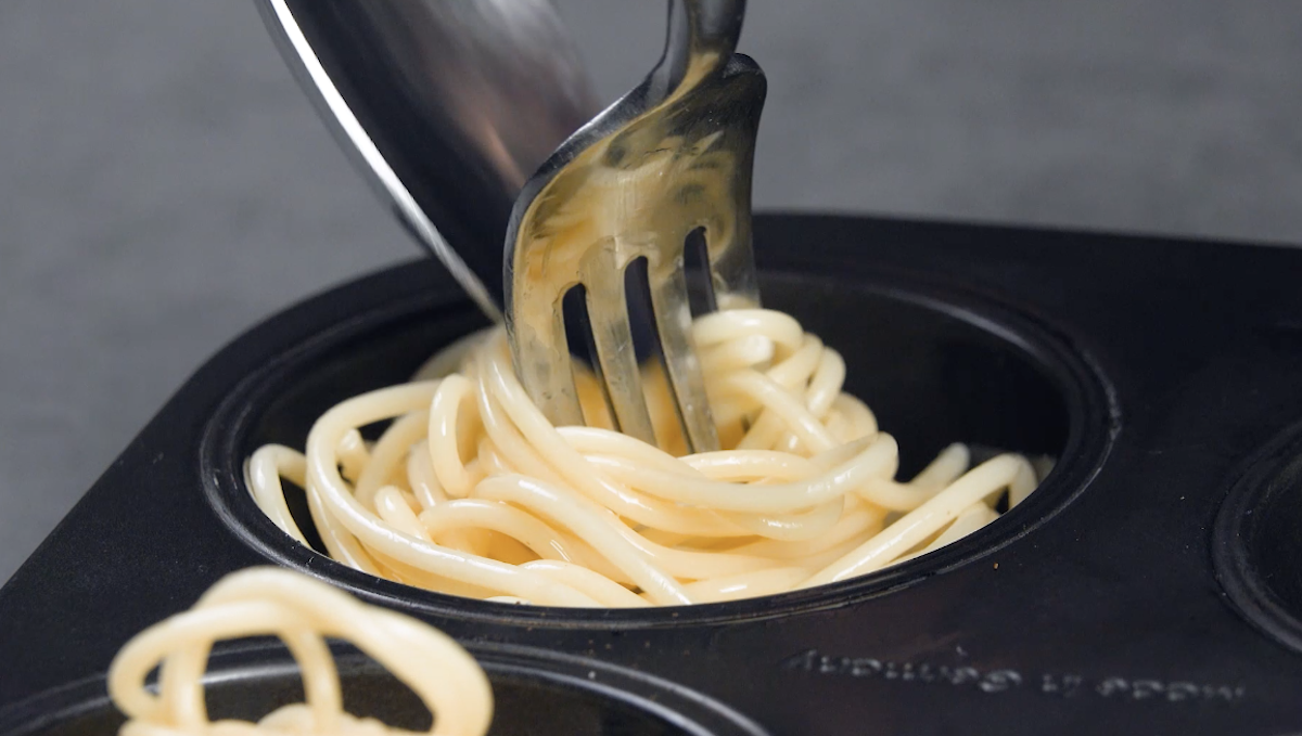 1.2) Pinsle eine Muffinform mit Öl aus. Drehe dann mit einem Löffel und mit einer Gabel kleine Portionen deiner übriggebliebenen Spaghetti auf und befülle die einzelnen Mulden der Muffinform mit den „Nudel-Nestern“.