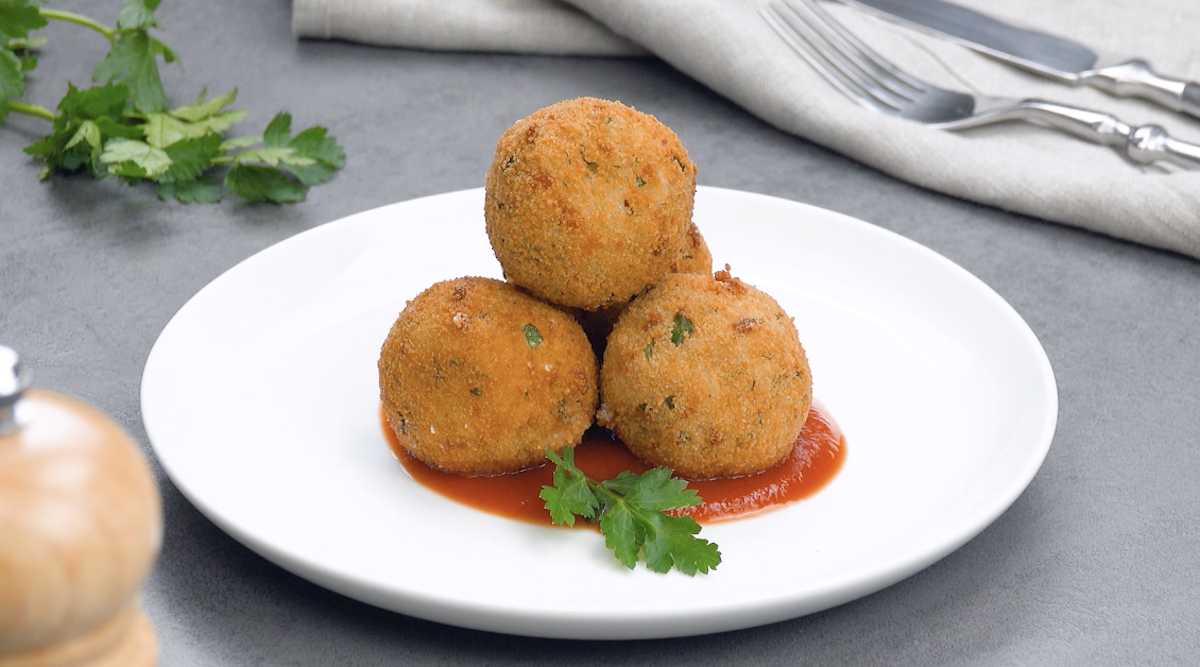 3.2) Wende die Bällchen in der zweiten Portion Paniermehl und frittiere sie in etwa 175 °C heißem Öl.