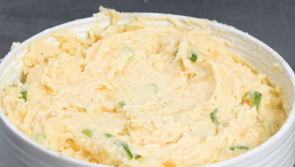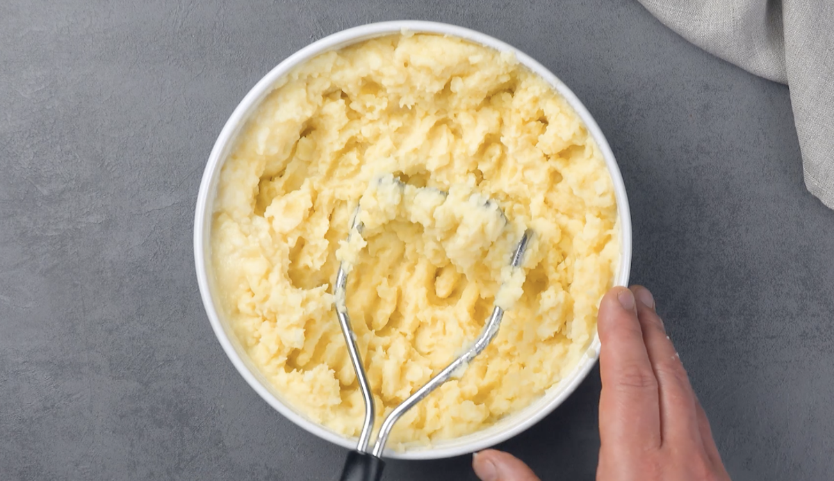 So geht es: 2.1) Erwärme deine übriggebliebenen, kalten Kartoffeln in der Mikrowelle und gib heiße Milch und Butter hinzu. Stampfe nun alles zu einem Brei.