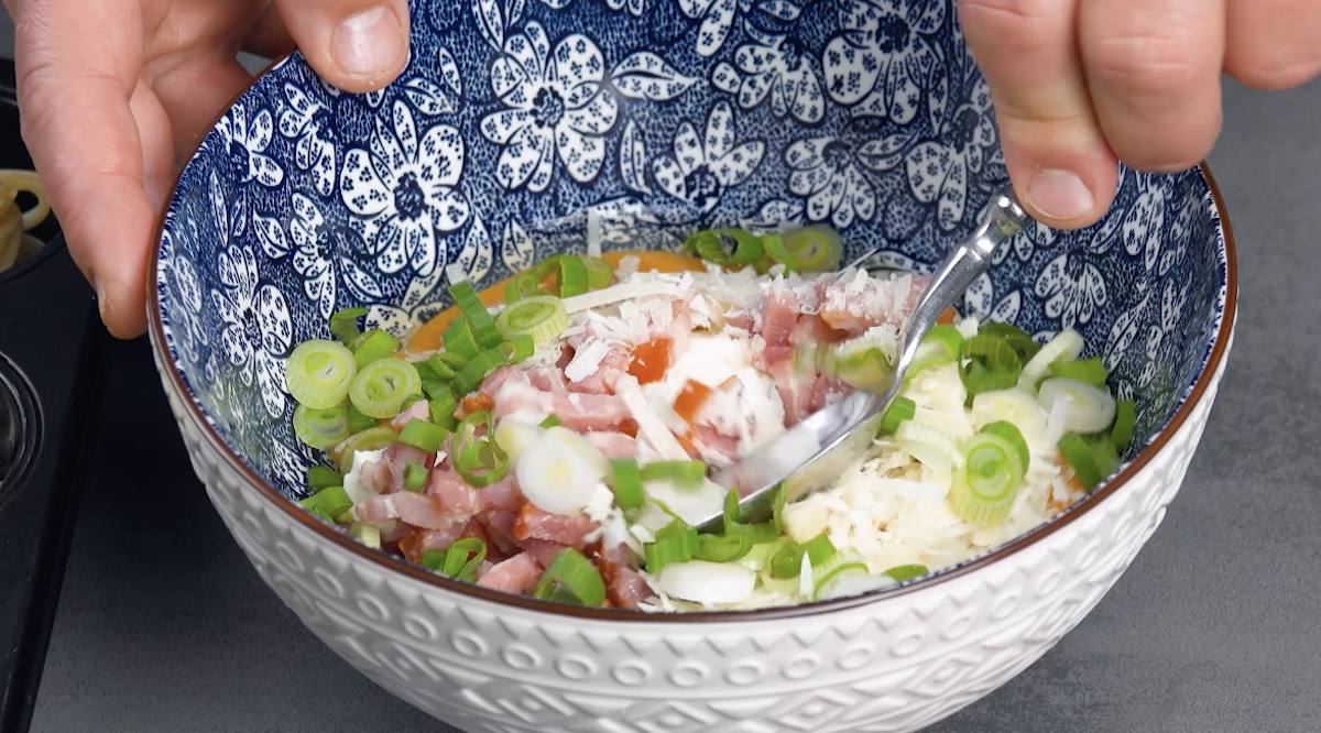 So geht es: 1.1) Gib Crème fraîche, Parmesan, Speck, Eier und klein geschnittene Frühlingszwiebeln in eine Schüssel und vermenge alles miteinander.