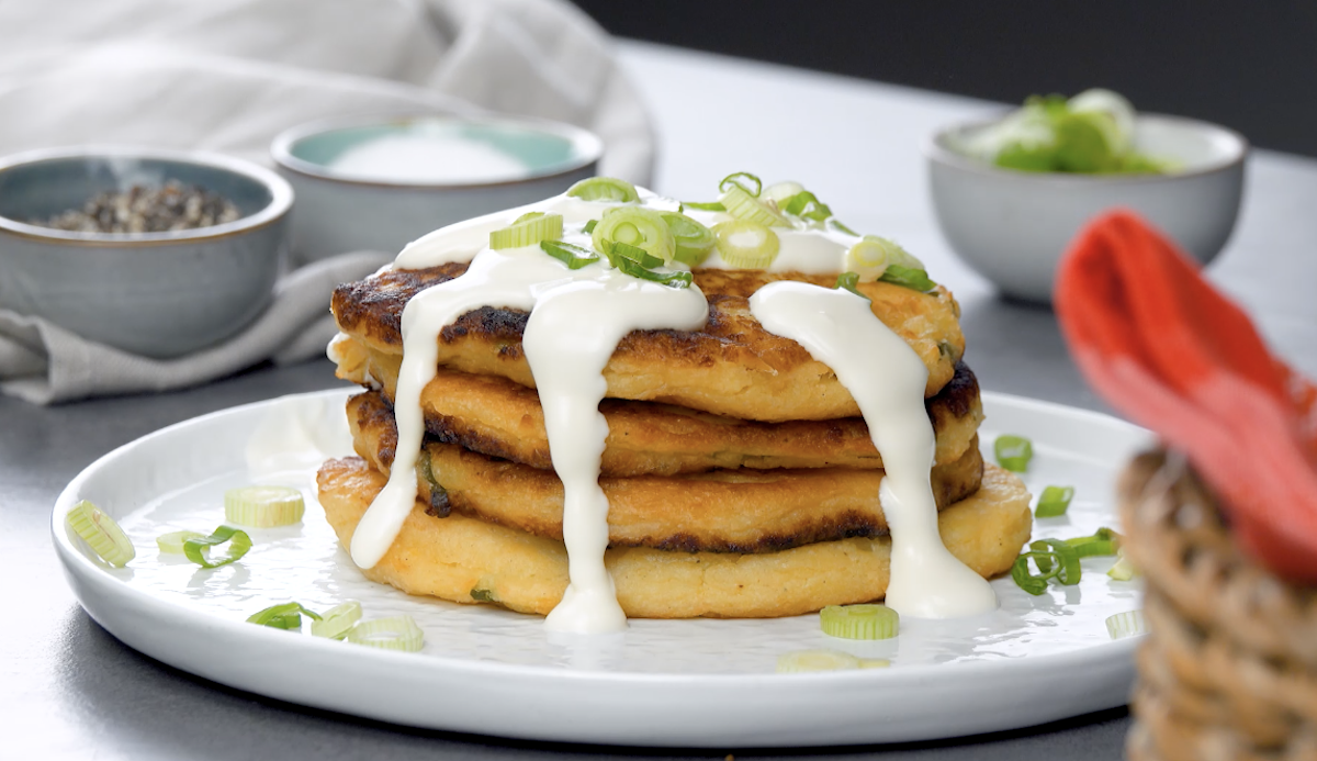 2.3) Reibe deine Hände mit ein bisschen Öl ein und forme nun kleine Pfannkuchen aus der Kartoffelmasse. Brate die Pfannkuchen von beiden Seiten, bis sie goldbraun sind. Serviere die Kartoffelpfannkuchen, garniert mit Sauerrahm und Frühlingszwiebeln.