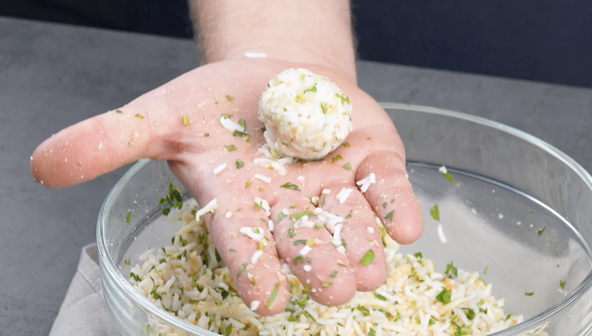 So geht es: 3.1) Vermenge Reis mit Ei, den 50 g Paniermehl, klein gehackter Petersilie und Käse und forme aus der Masse kleine Bällchen mit je einem Mini-Mozzarella als Füllung.