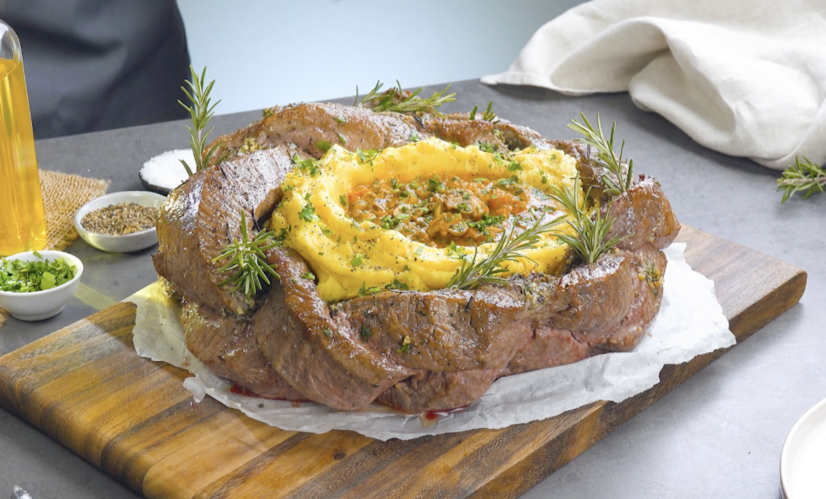 Schon einmal Fleisch geflochten? Einmal ist immer das erste Mal. Serviere Rindfleisch mit Kartoffelbrei und Gemüsesoße als saftigen Fleischzopf. Dieses Rezept macht das Abendessen zum Happening.