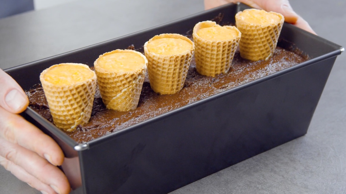 2. Verrühre alle Zutaten für den Rüblikuchen miteinander. Befülle dann fünf Eiswaffeln mit dem Rüblikuchenteig und stecke sie in gleichmäßigen Abständen in den Schokoladenteig.