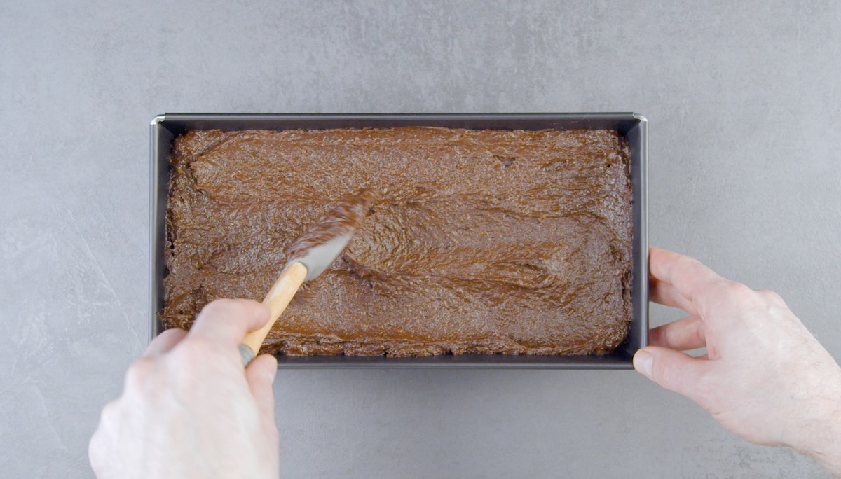 1. Verrühre alle Zutaten für den Schokoladenkuchen miteinander und fülle den Teig in eine eingefettete Kastenform.