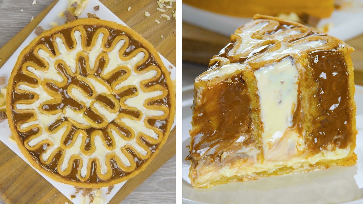 Serviere und genieße den Kuchen am besten, solange er noch lauwarm ist. Eine traumhafte Kombination aus Schokolade, Pastetenteig und Vanillepudding. Sobald du den Falt-Trick heraushast, macht sich der Kuchen wie von selbst. Eine richtig schöne Idee für einen Kuchen mit bleibendem Eindruck – sowohl optisch als auch geschmacklich.