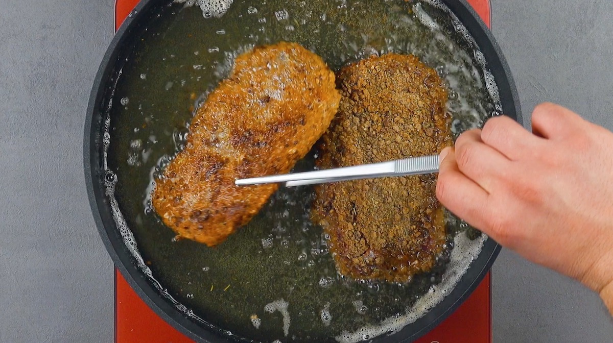 3. Backe die panierten Rumpsteaks anschließend von beiden Seiten in reichlich Pflanzenöl ca. 5 Minuten aus.
