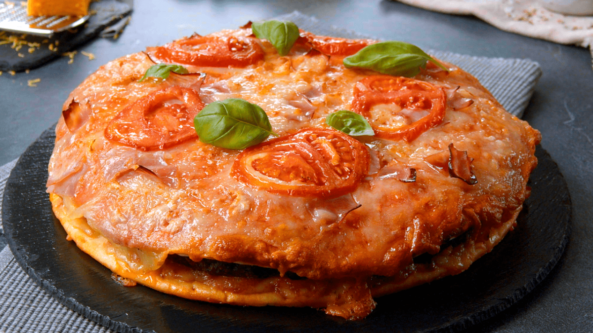 5. Lege nun die zweite Pizza mit dem Belag nach unten auf den Patty. Bestreiche den Pizzaboden dann mit den restlichen passierten Tomaten. Bestreue das Ganze mit Mozzarella und belege den Käse noch mit Schinkenstücken und Tomatenscheiben.