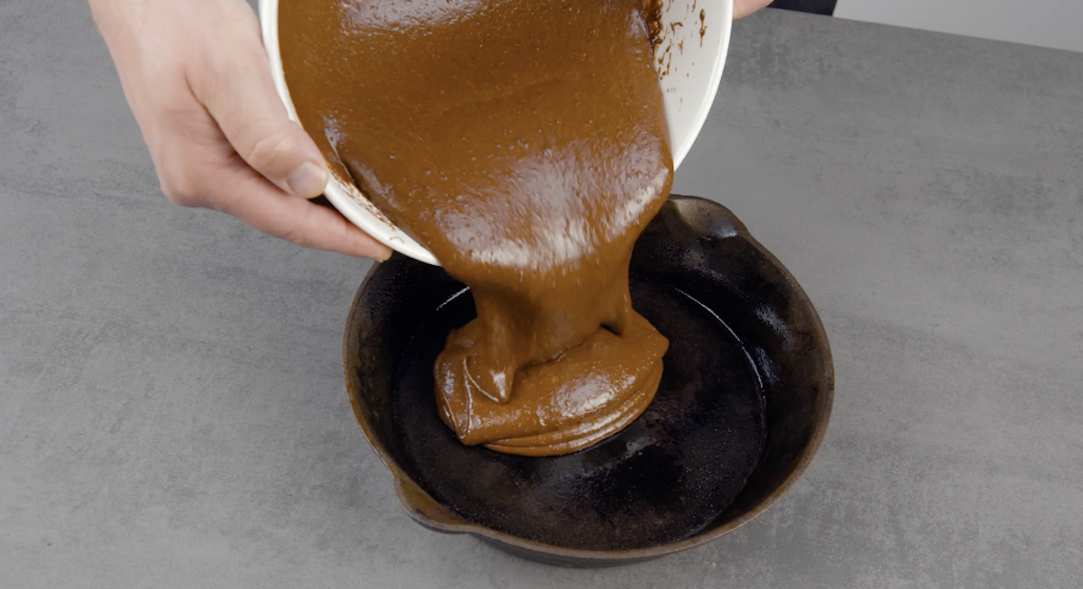 2. Für den Brownie schmilzt du Butter und Schokolade über einem Wasserbad. Verrühre alles gut miteinander. Siebe dann Mehl, Backpulver und Salz dazu und verrühre das Ganze mit Öl, Vanillearoma, braunem Zucker und Eiern zu einem glatten Teig. Gib den Teig in eine leicht gefettete gusseiserne Pfanne.