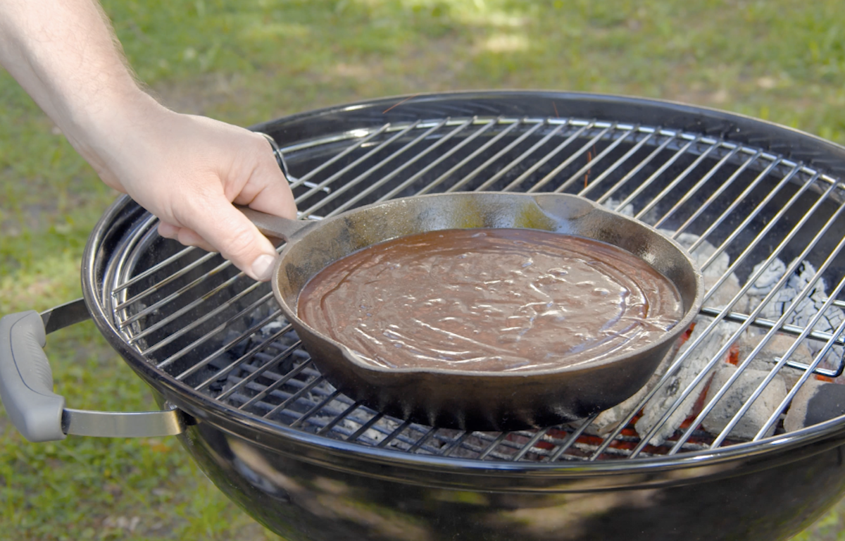 3. Stelle die Pfanne für ca. 45 Minuten bei geschlossenem Deckel und indirekter Hitze auf den Grill.